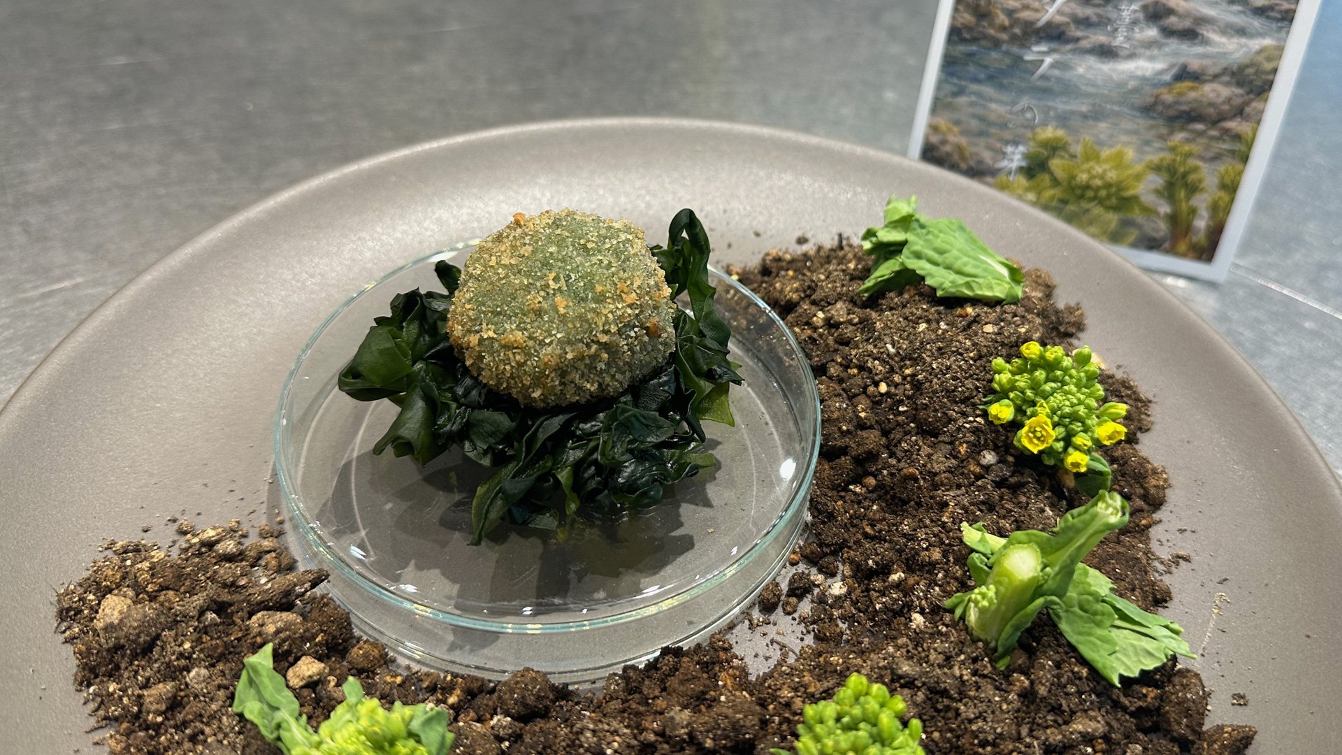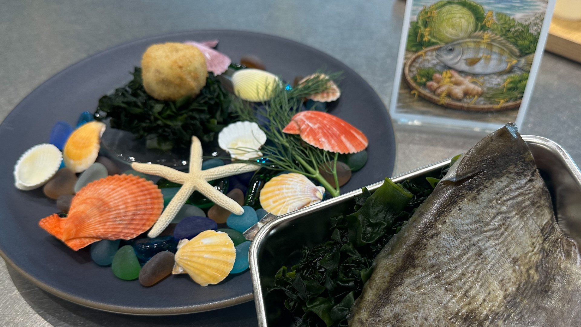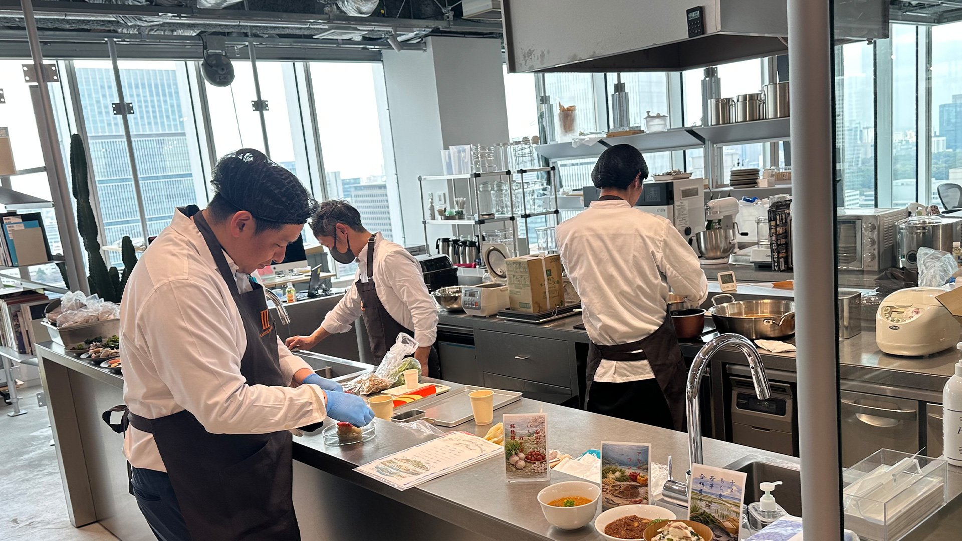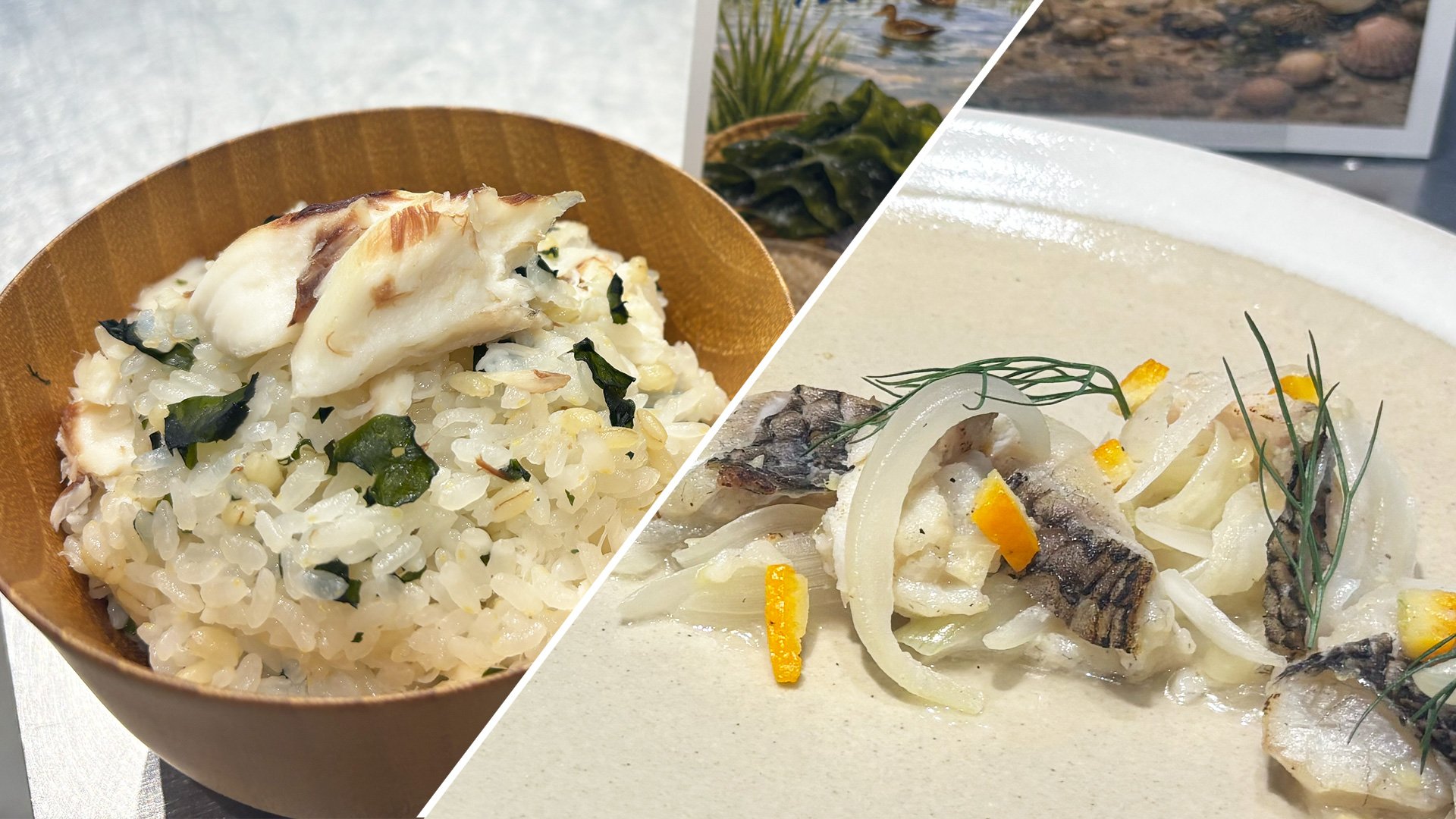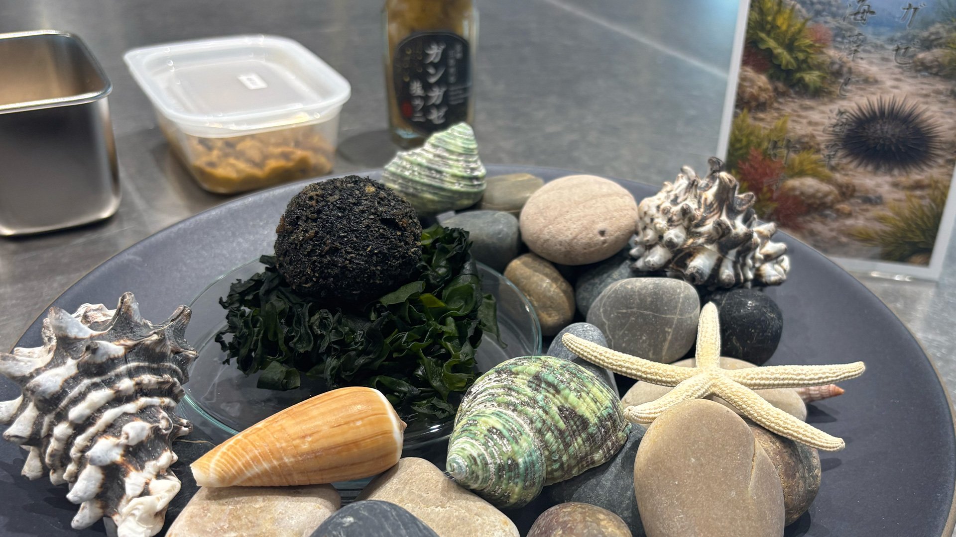 第二部はキッチンスペースに移動しての懇談会。今回は八芳園で腕を振るうシェフたちのご協力で、藻場の天敵とされる「クロダイ」「アイゴ」「アカエイ」など、食卓ではお目にかかれない「未利用魚」たちを調理。また、ウニの仲間で、こちらも藻場を食べ荒らす「ガンガゼ」を使った料理を、「自然の循環」をイメージして提供して頂きました。