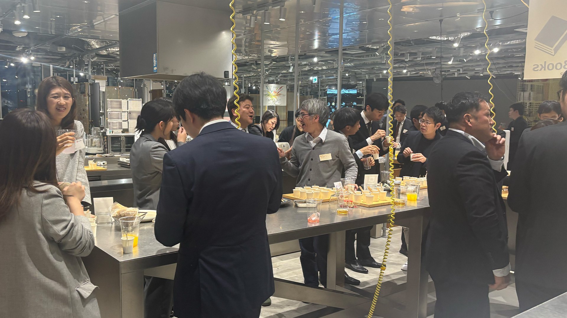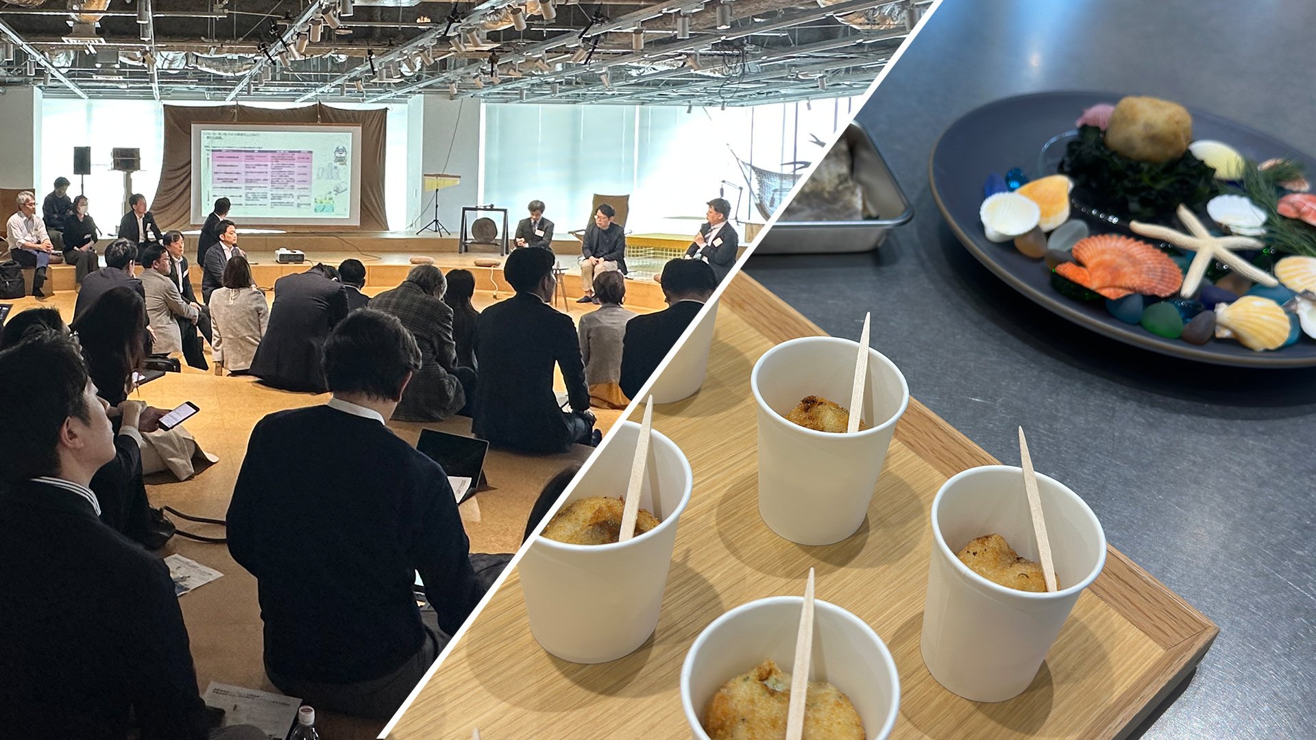 今回の開催場所は、博報堂の「UNIVERSITY of CREATIVITYラウンジ」。当日は約40社100人が集まり、登壇者と膝を突き合わせたパネルディスカッションや、『藻場』を食べ荒らしてしまうことから、「食害魚」と呼ばれ市場にほとんど出回らない「未利用魚」を美味しく食べてみよう!ということで、おつまみを囲んで交流会も実施しました。